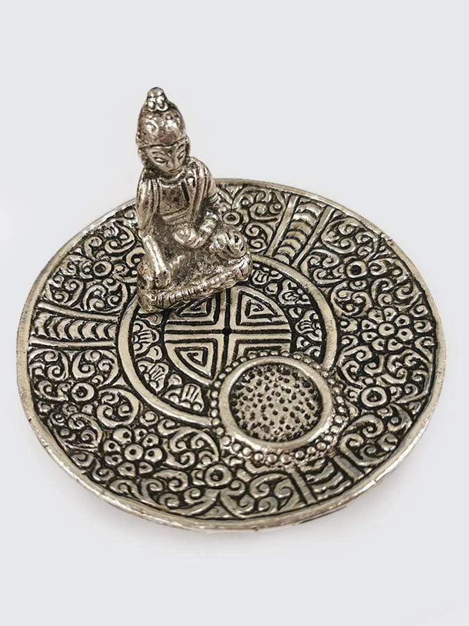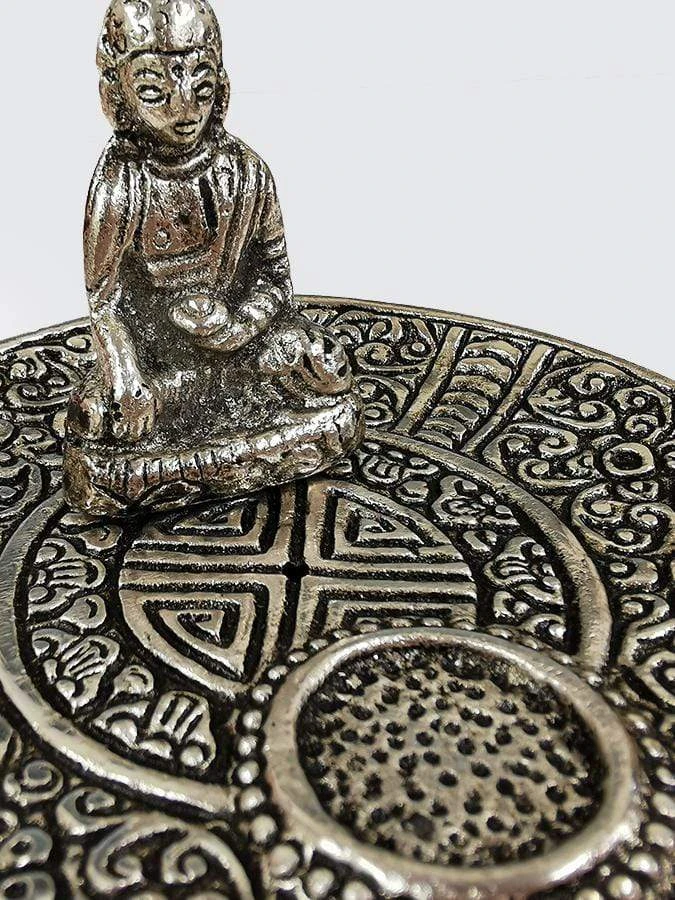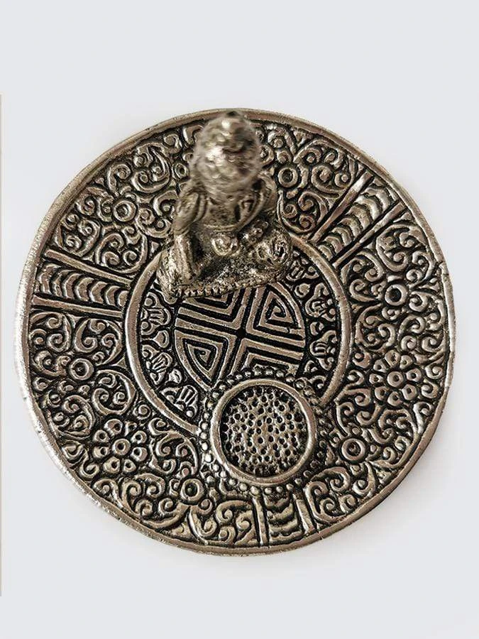 An ornately carved metal incense burner with a meditating Buddha in the center. The carvings cover the top and bottom.