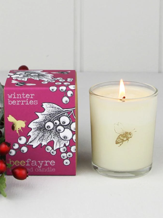 - Hand poured natural plant wax candle, in recycled glass with a honeybee print.