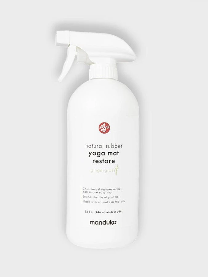 Manduka’s Natural Rubber Yoga Mat Restore uses 100% naturally derived ingredients to maintain the performance of your eKO Series yoga mat. Natural Rubber Yoga Mat Restore can be used on any natural rubber yoga mats. Formulated to reverse the surface oxidation (which fades and discolors rubber mats), our gentle formulation brings back your mat’s original luster and extends its life. Use weekly for best results.
