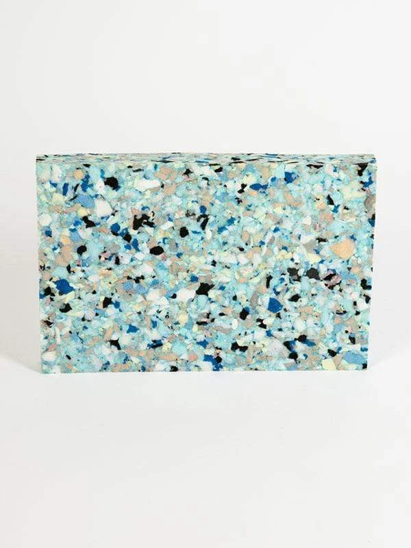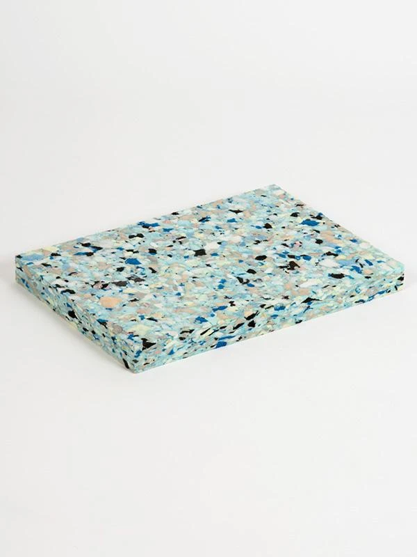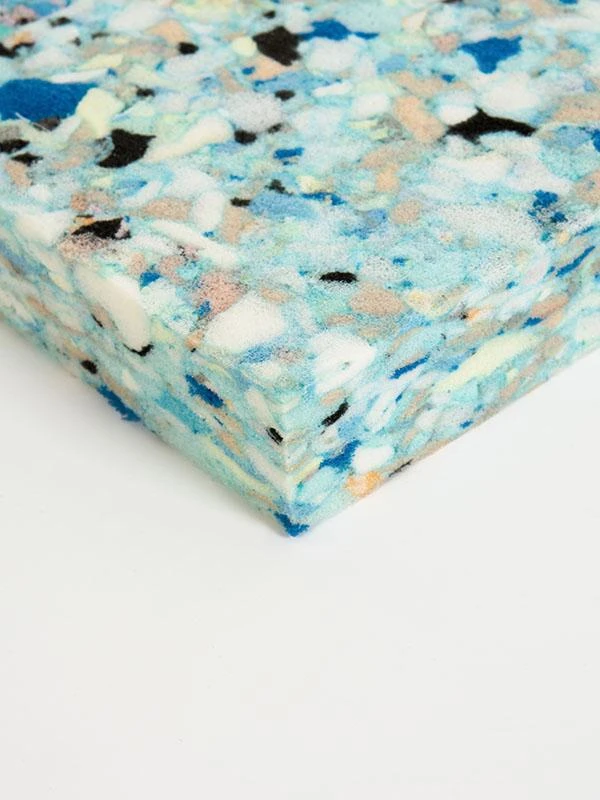 Made from densely compressed chipped foam, using offcuts from manufacturing other foam products, the colour varies from batch to batch, but is always of mottled / multicoloured appearance.